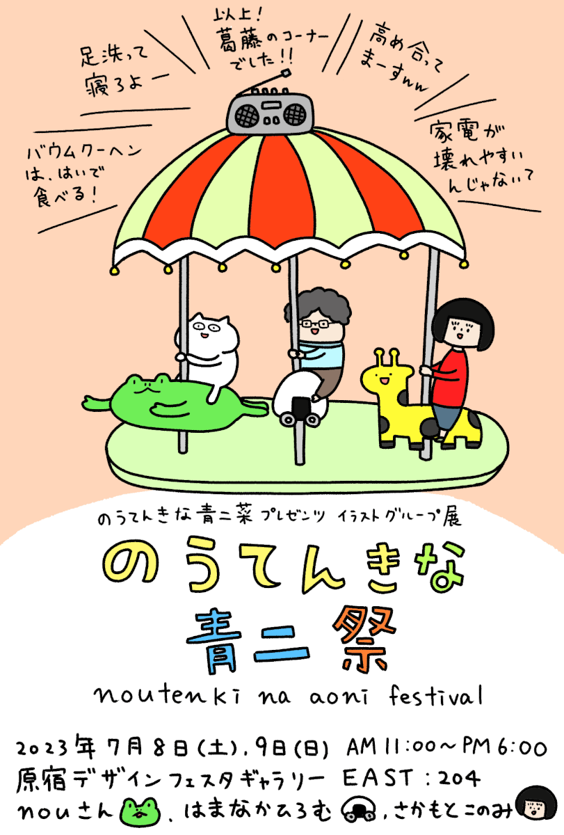 2023年7月8・9日 原宿デザフェスギャラリー EAST 204にて 絵描き3人によるラジオ『のうてんきな青二菜』の初のグループ展 『のうてんきな青二祭』を開催しました!! ラジオ5年目にして初のグループ展 たくさんの … 続きを読む のうてんきな青二菜のグループ展『のうてんきな青二祭』を開催しました!!